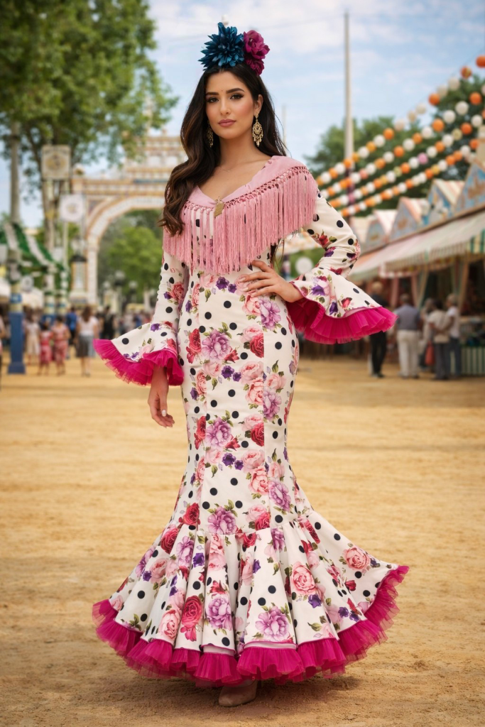 El corte entallado marca la silueta y termina en una falda con volantes amplios y movimiento, rematada con tul fucsia que hace que cada paso luzca aún más. Las mangas acampanadas y el mantoncillo con flecos integrados en rosa, aportan ese aire flamenco elegante que no pasa desapercibido.
